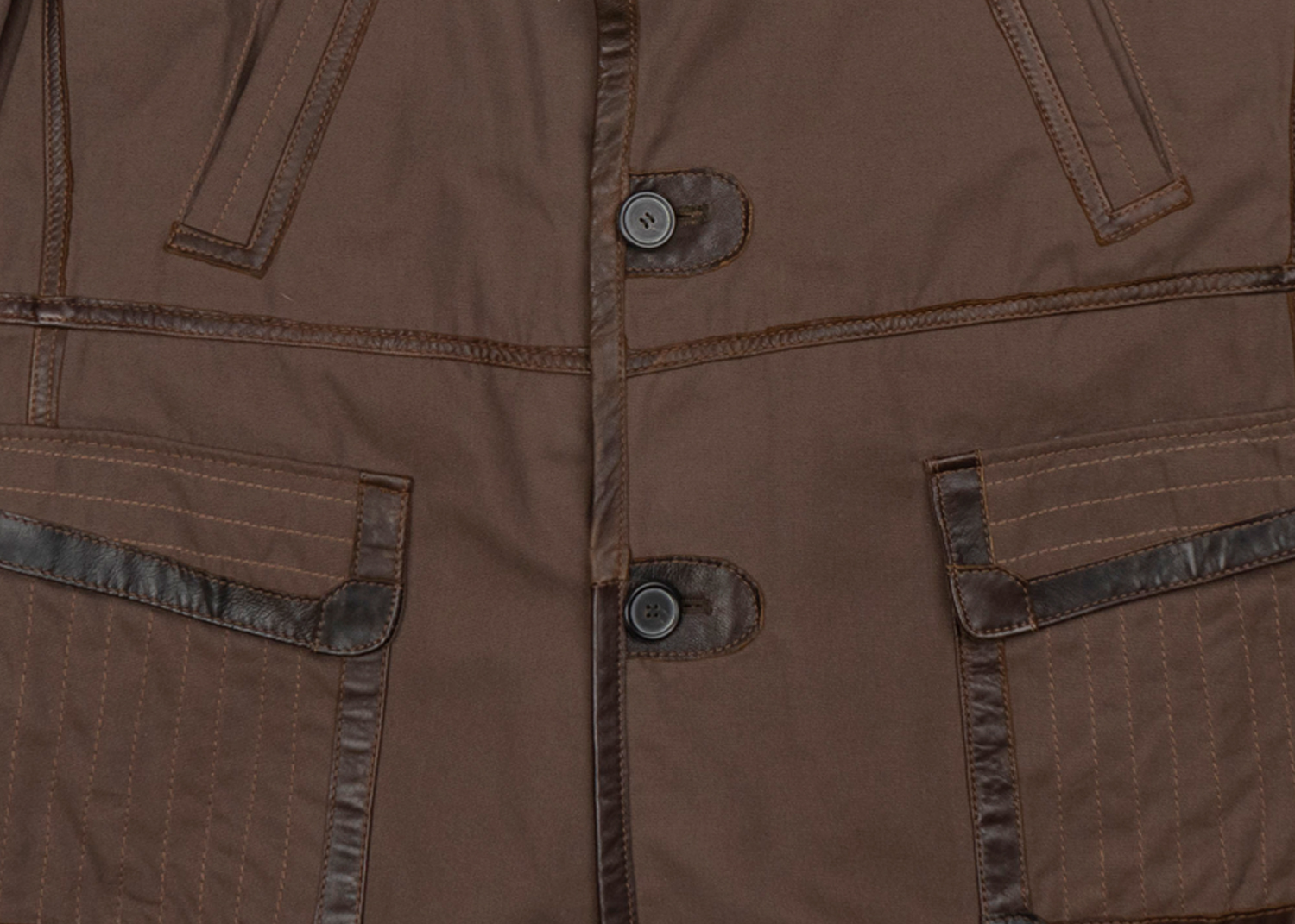 Пальто выполнено из плотного высококачественного хлопка с отделкой из натуральной кожи.